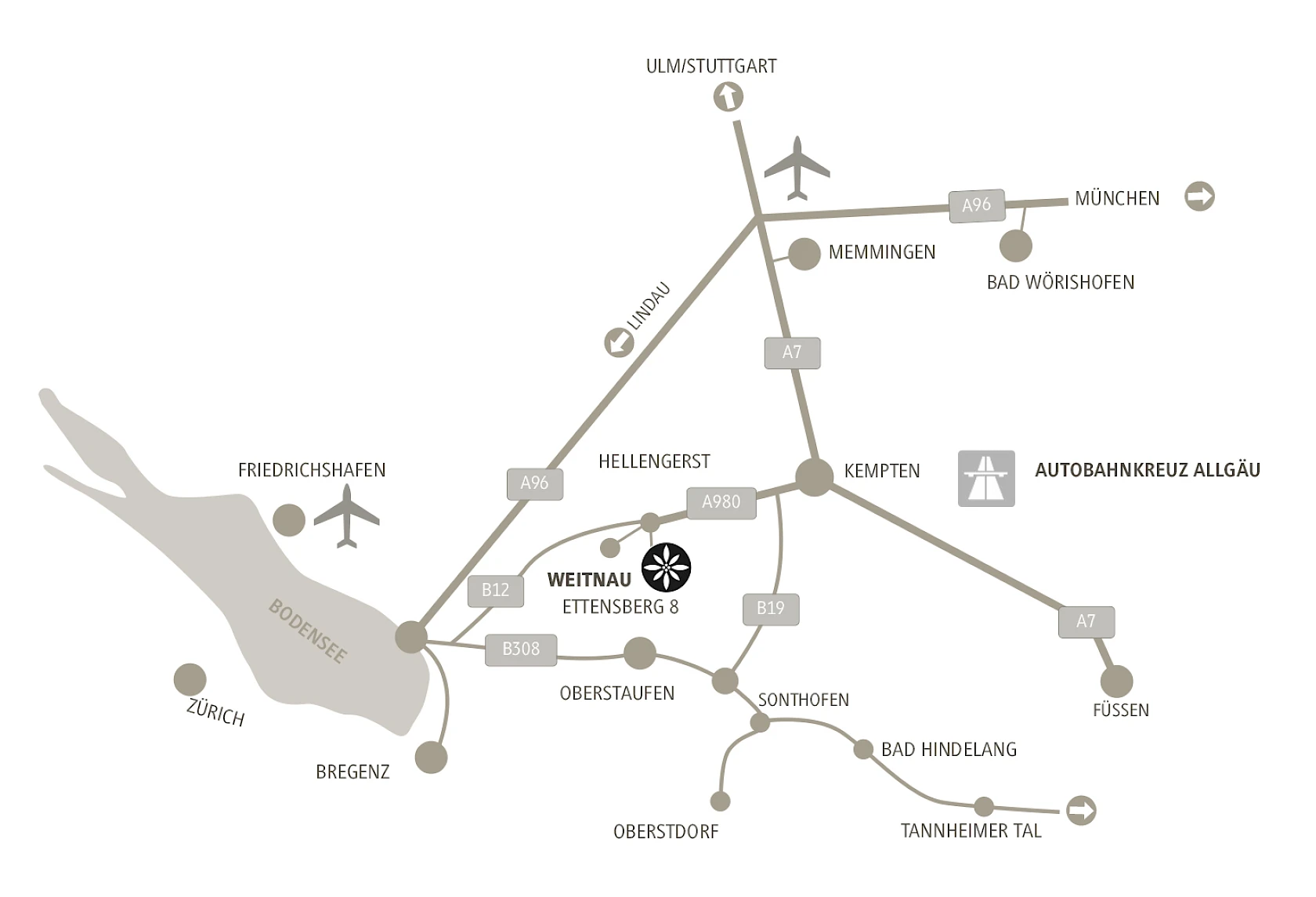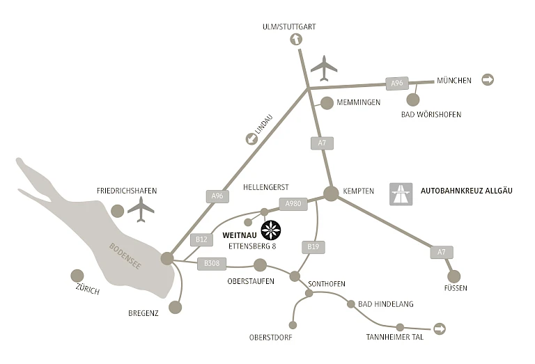 Von der A7 kommend nehmen Sie am Autobahnkreuz Dreieck Allgäu die Ausfahrt Richtung A980 Lindau/Oberstdorf/Sonthofen und folgen dann der B12 in Richtung Isny. Auf der B12 nehmen Sie die Ausfahrt Richtung Hellengerst/Wengen/Buchenberg/Rechtis und biegen nach der Abfahrt rechts ab. An der nächsten Kreuzung biegen Sie links ab auf die Helingerstraße und nach ca. 150 m rechts auf den Ettensberger Weg, dem Sie bis zum Chalet folgen. Nach ein paar Kurven öffnet sich der Blick – und Sie sind angekommen.